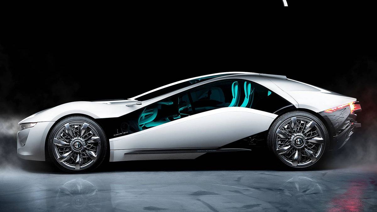 This concept is rear wheel drive, it is powered by V8 4.7 liter engine placed in front which develops 450 horse power and it goes from 0- 100km/h in 3.9 seconds. It essentially has an engine from Alfa Romeo 8C. It is a two-seater coupe with many unusual details and features.